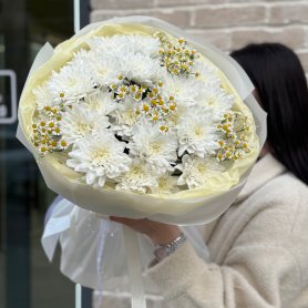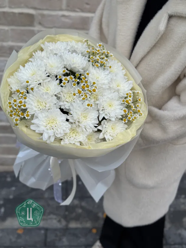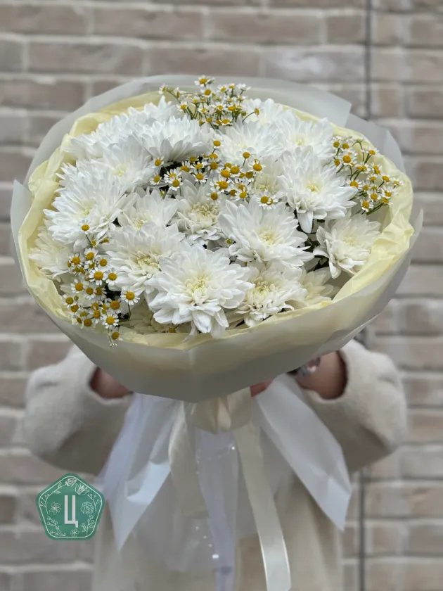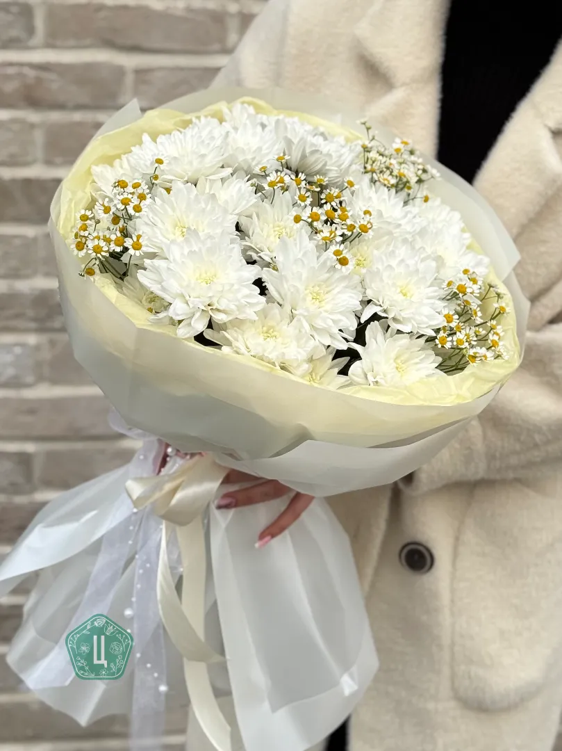 Букет «Цвети» с кустовыми хризантемами и матрикарией