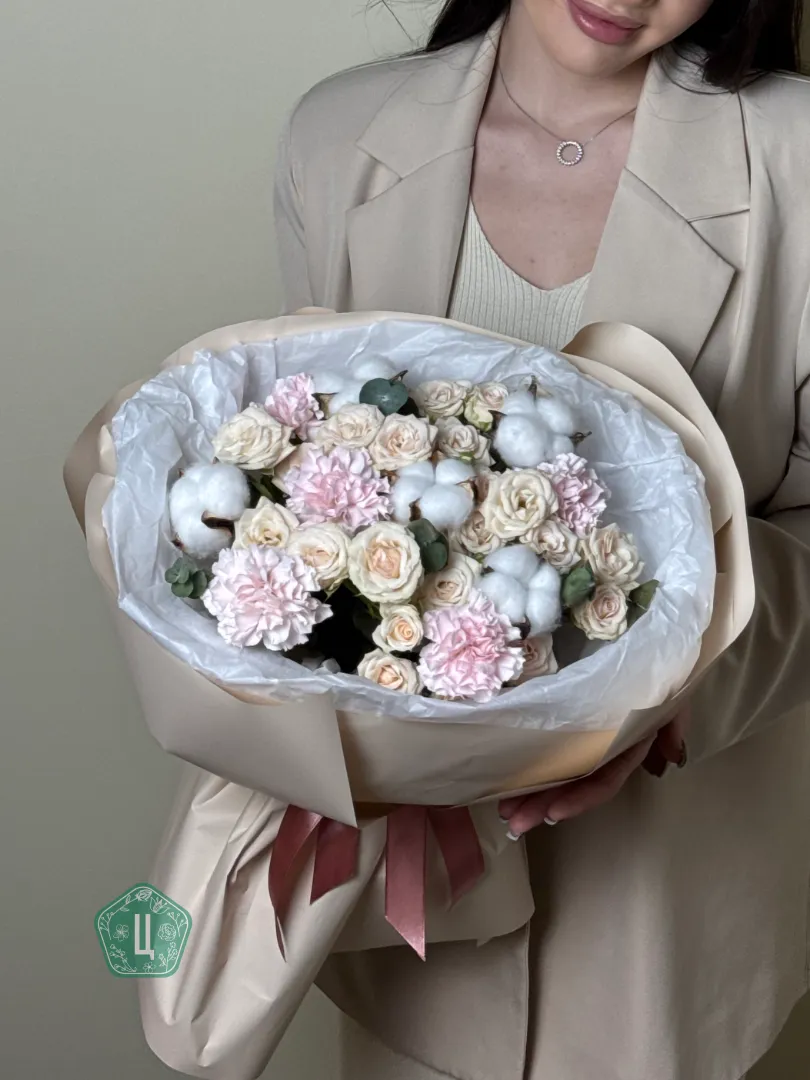 Нежный букет с диантусами, хлопком, кустовыми розами и эвкалиптом — это гармония воздушности, уюта и утончённой эстетики. Мягкие оттенки диантусов сочетаются с пушистыми облачками хлопка, а изящные кустовые розы придают композиции романтичность. Свежий эвкалипт добавляет букеты лёгкость, природный аромат и стильный современный акцент.