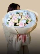 Композиция выглядит тёплой, нежной и очень деликатной — идеальный выбор для подарка девушке, подруге, маме или просто дорогому человеку. Такой букет создаёт ощущение заботы и нежности с первого взгляда и дарит мягкое, светлое настроение.