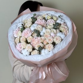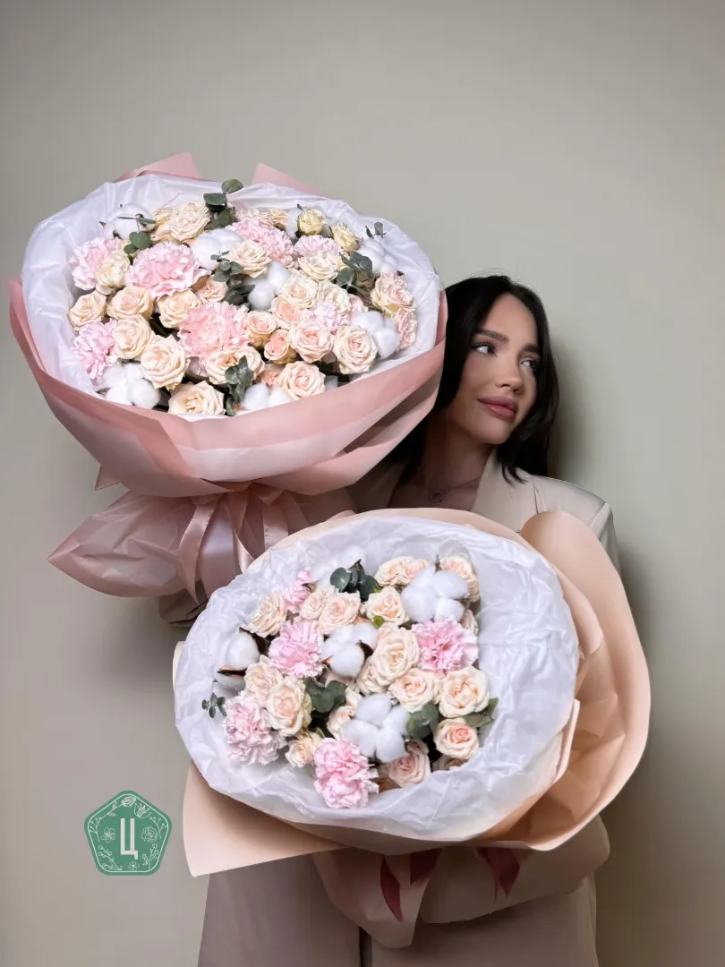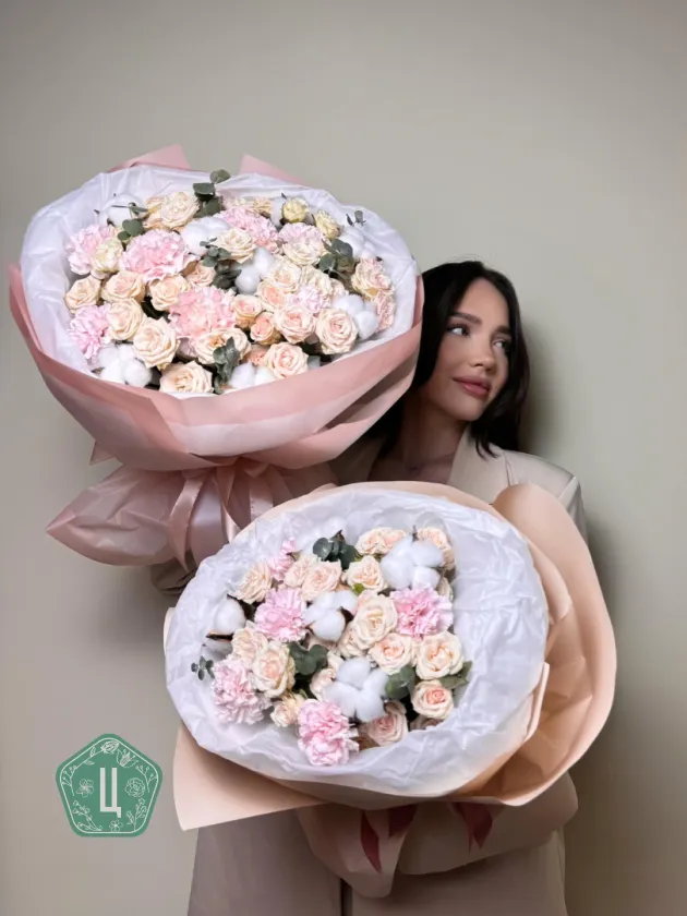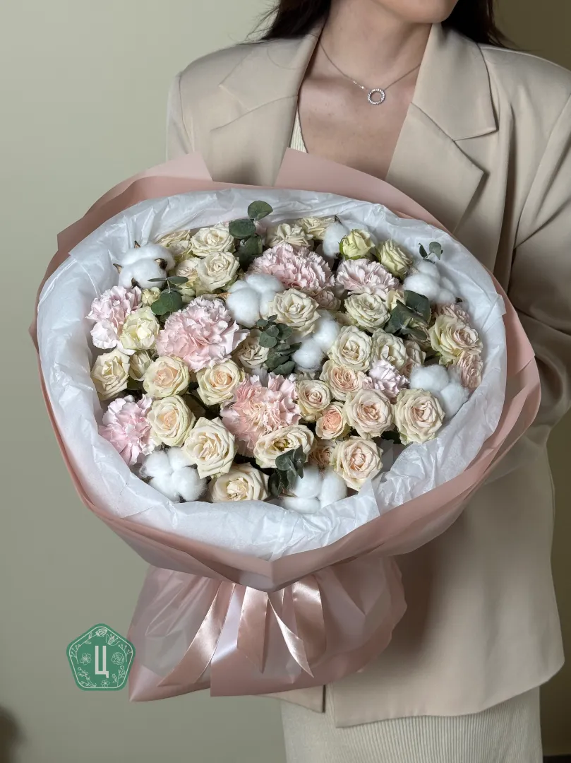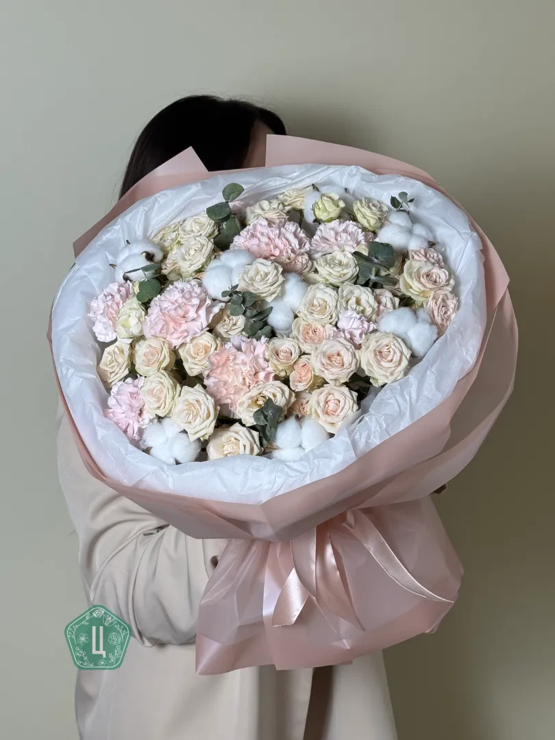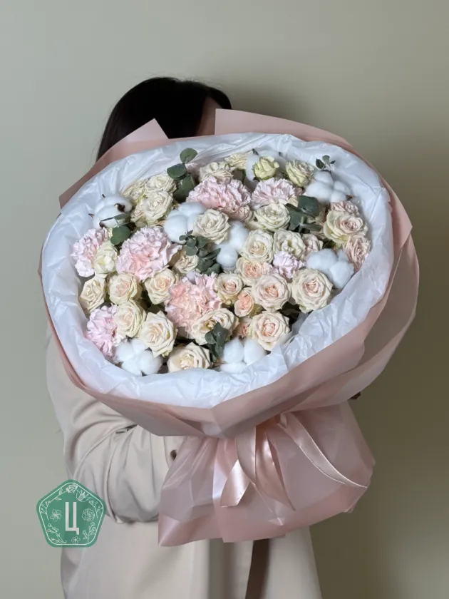 Нежный букет с диантусами, хлопком, кустовыми розами и эвкалиптом — это гармония воздушности, уюта и утончённой эстетики. Мягкие оттенки диантусов сочетаются с пушистыми облачками хлопка, а изящные кустовые розы придают композиции романтичность. Свежий эвкалипт добавляет букеты лёгкость, природный аромат и стильный современный акцент.