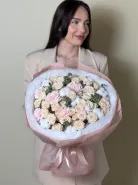 Композиция выглядит тёплой, нежной и очень деликатной — идеальный выбор для подарка девушке, подруге, маме или просто дорогому человеку. Такой букет создаёт ощущение заботы и нежности с первого взгляда и дарит мягкое, светлое настроение.