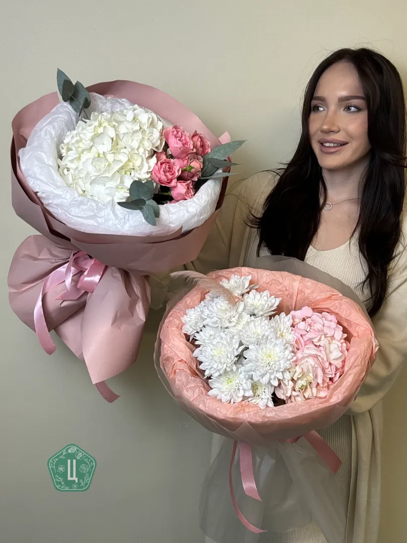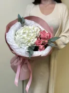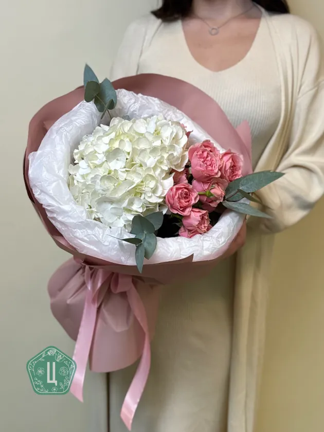 Воздушная гортензия в сочетании с изящными кустовыми розами создаёт гармоничный и очень трогательный букет, наполненный теплом и заботой.