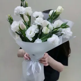 Нежный букет с тюльпанами, эустомой и гвоздикой