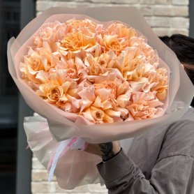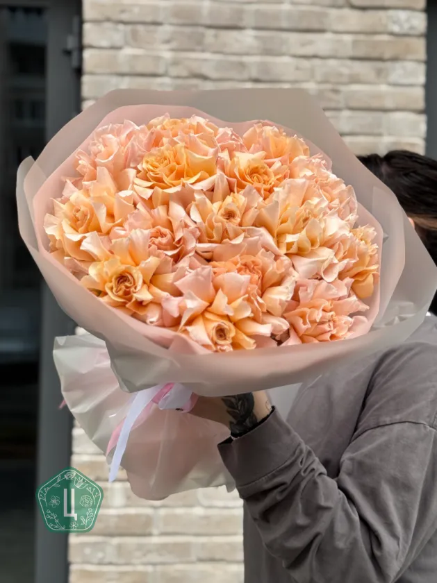 Букет, представленный на изображении, это роскошный и нежный композит из светло-персиковых французских роз, элегантно упакованный в полупрозрачную белую бумагу с легким розовым оттенком. Нежные оттенки цветов создают атмосферу тепла и изящества, делая букет идеальным выбором для выражения любви и признательности.