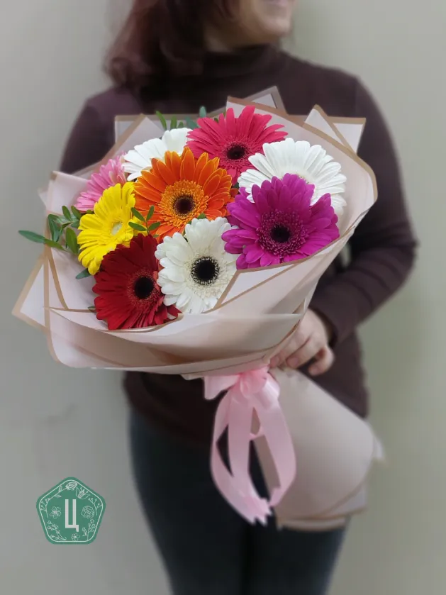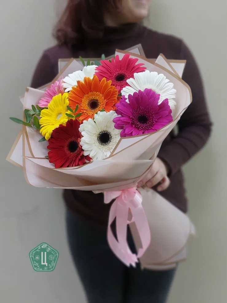 Стильный букет из сортовых гербер, обрамленный в нежную упаковку, станет прекрасным подарком к любому празднику.