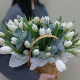 Корзина с белыми тюльпанами эвкалиптом