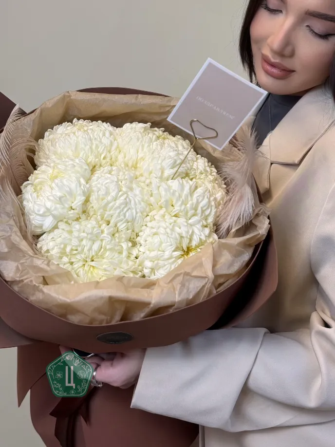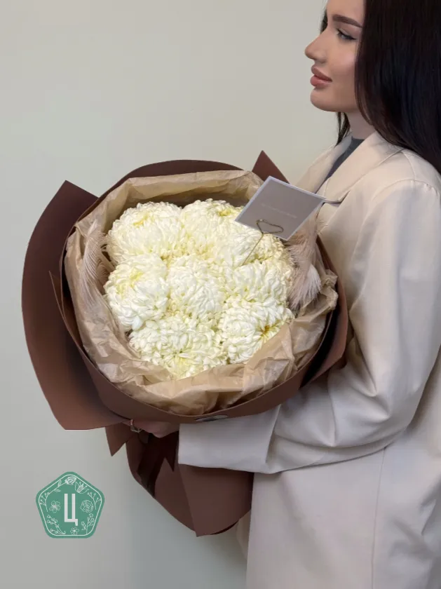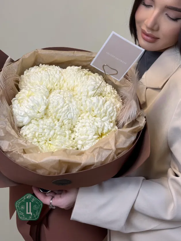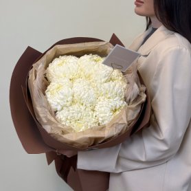 Букет из белых хризантем, элегантно упакованный в коричневую бумагу, создает впечатление воздушности и чистоты. Хризантемы, собранные в плотную композицию, выглядят очень свежо и привлекательно. Этот букет подойдет для выражения нежных чувств и станет прекрасным подарком.