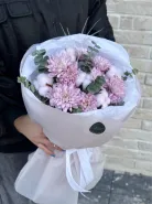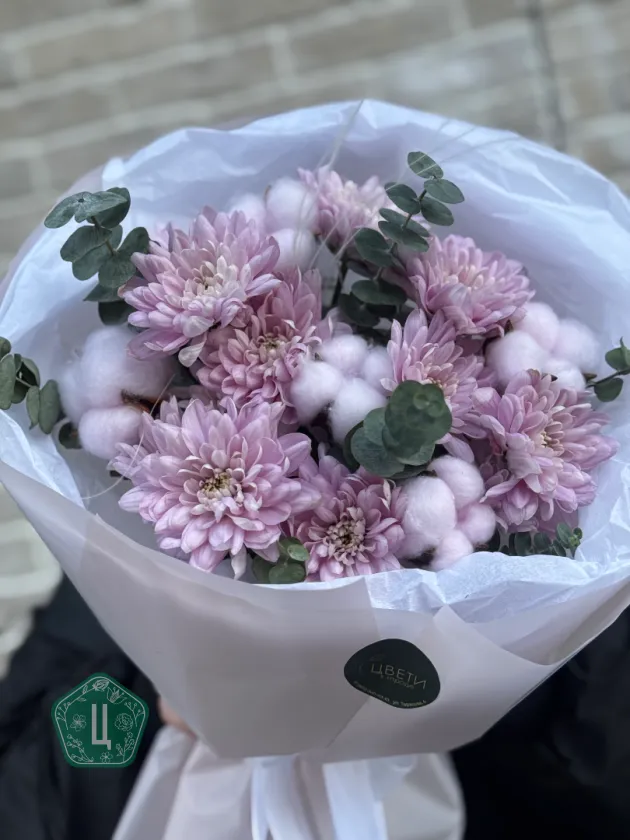 Букет из нежных розовых хризантем, дополненный хлопком и эвкалиптом, создает атмосферу легкости и природной гармонии. Сдержанная элегантность и ненавязчивая красота делают его прекрасным выбором для любого повода. Хризантемы в оттенках бледно-розового цвета окружены воздушными белыми хлопковыми пухнастиками и свежими веточками эвкалипта, что придает композиции дополнительный объем и изящество.