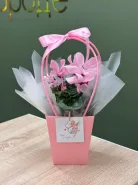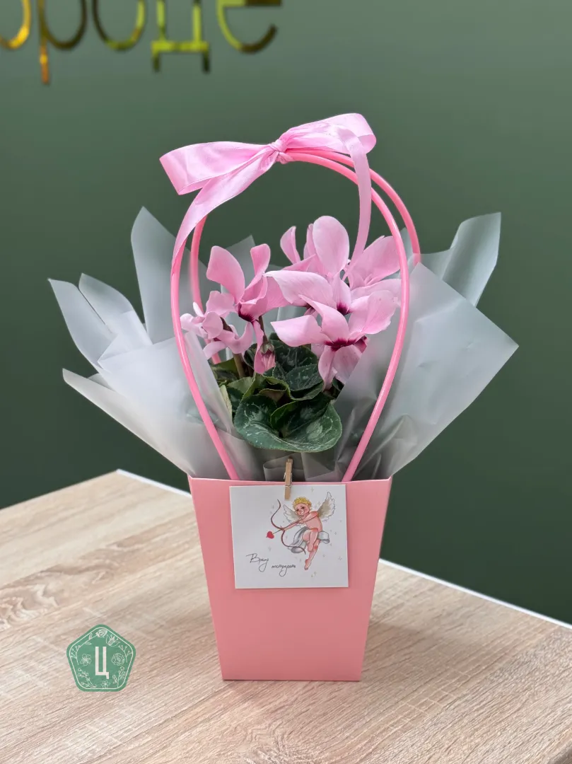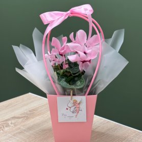 Цикламен розовый в сумочке с открыткой