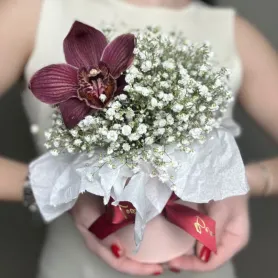 Гипсофила + орхидея композиция в шляпной коробке