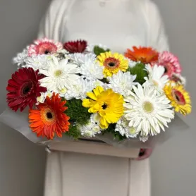 Яркая композиция с герберами в ящике