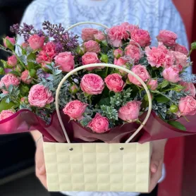Композиция с кустовыми розами в сумочке