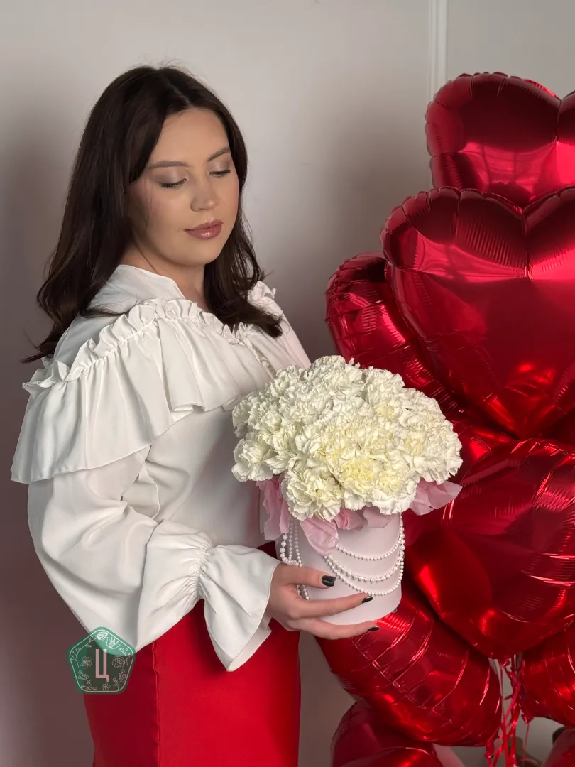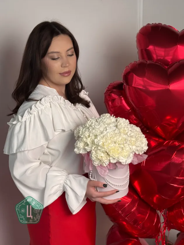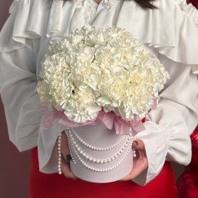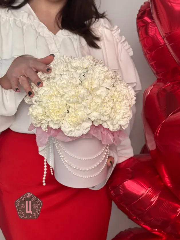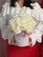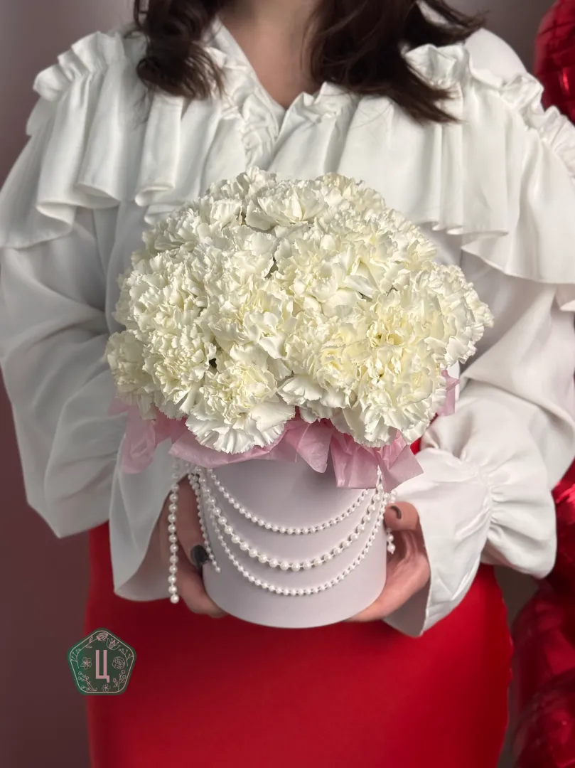 Композиция в шляпной коробке с диантусами идеальный вариант для тех кто ценит стойкость до двух недель