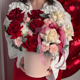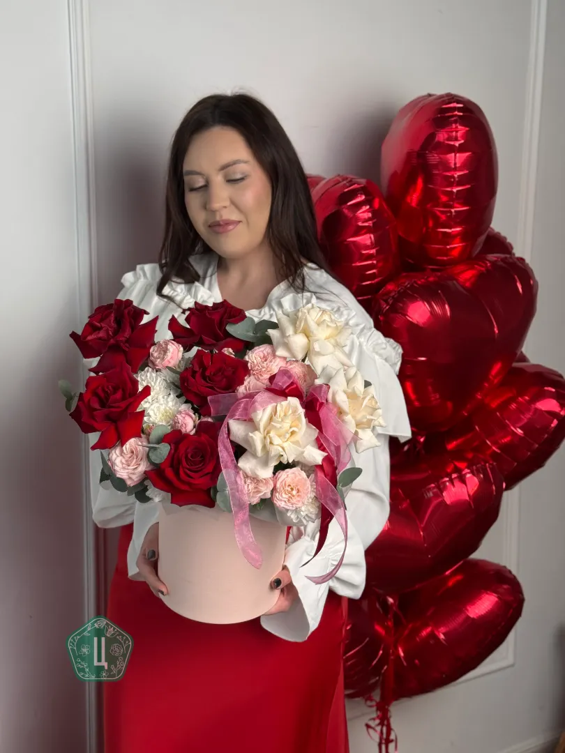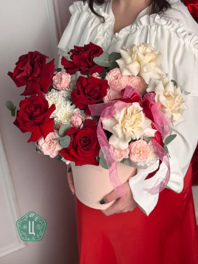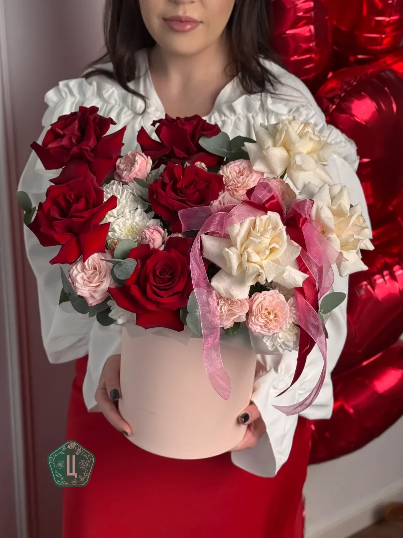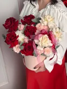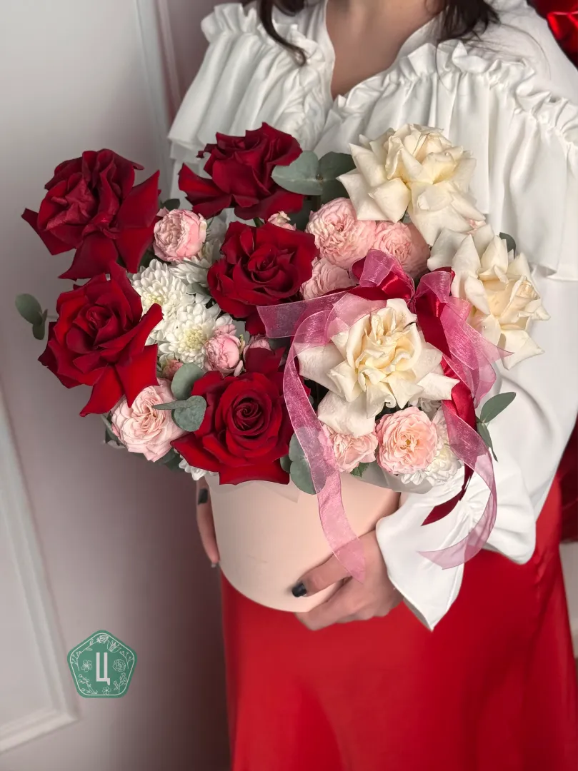 Красочная огненная композиция с французскими розами произведёт неизгладимое впечатление на получателя