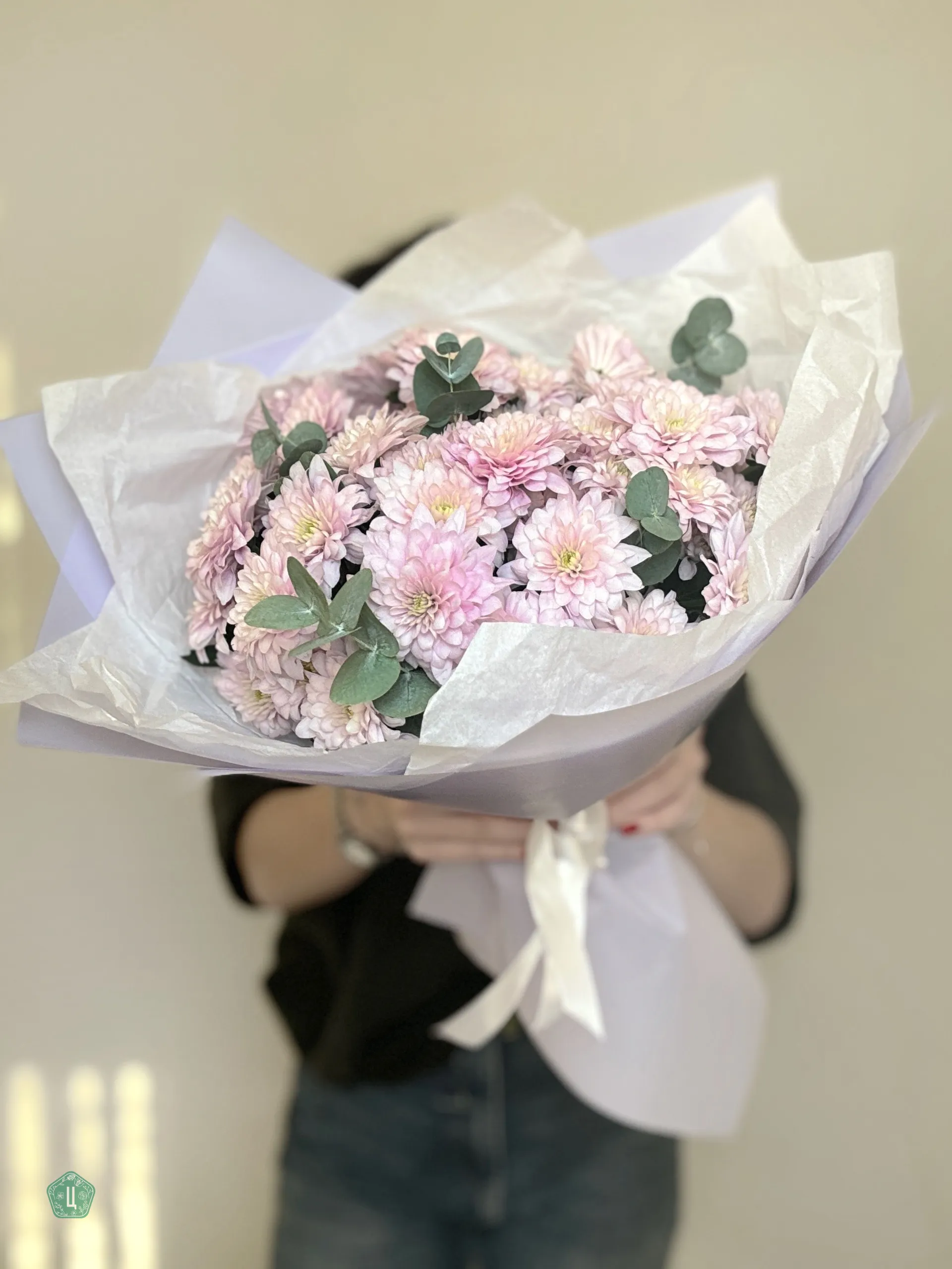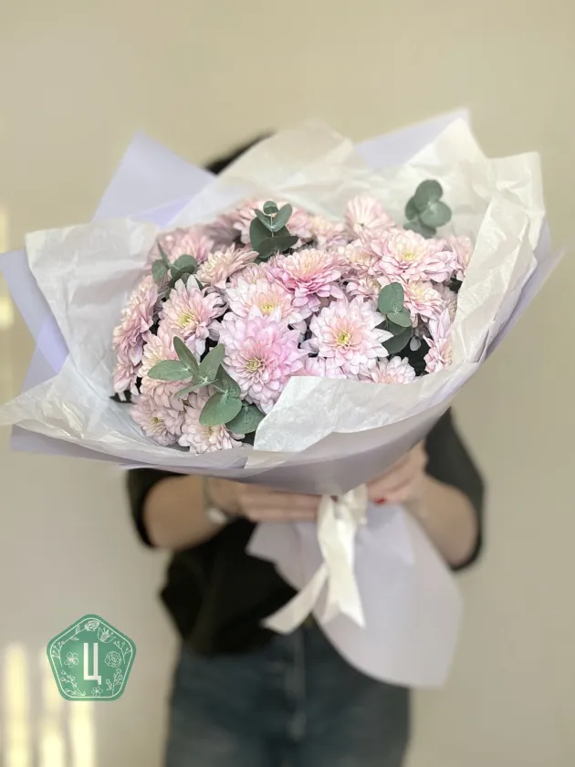 Букет 7 кустовых хризантем с эвкалиптом «Прелесть»