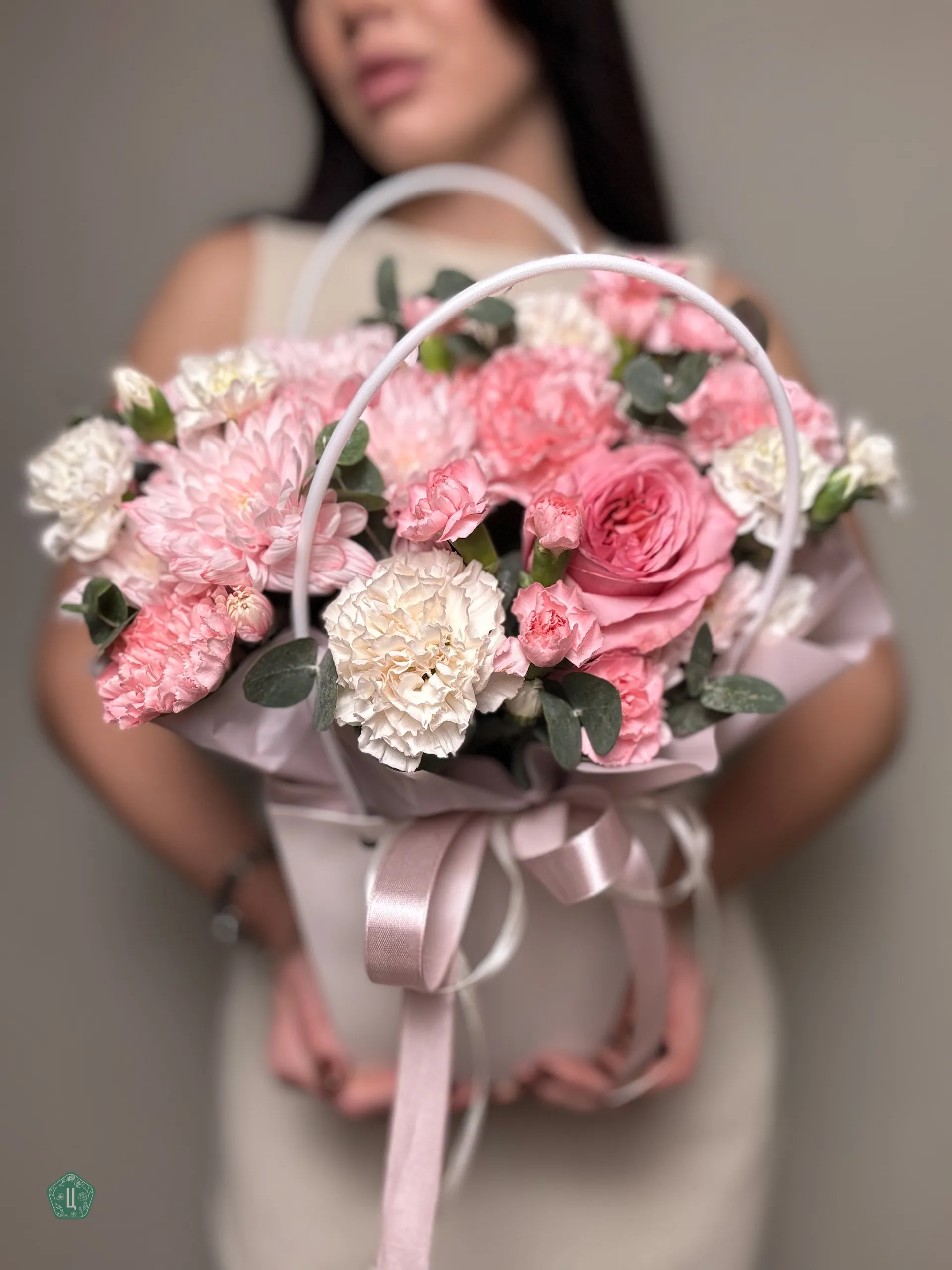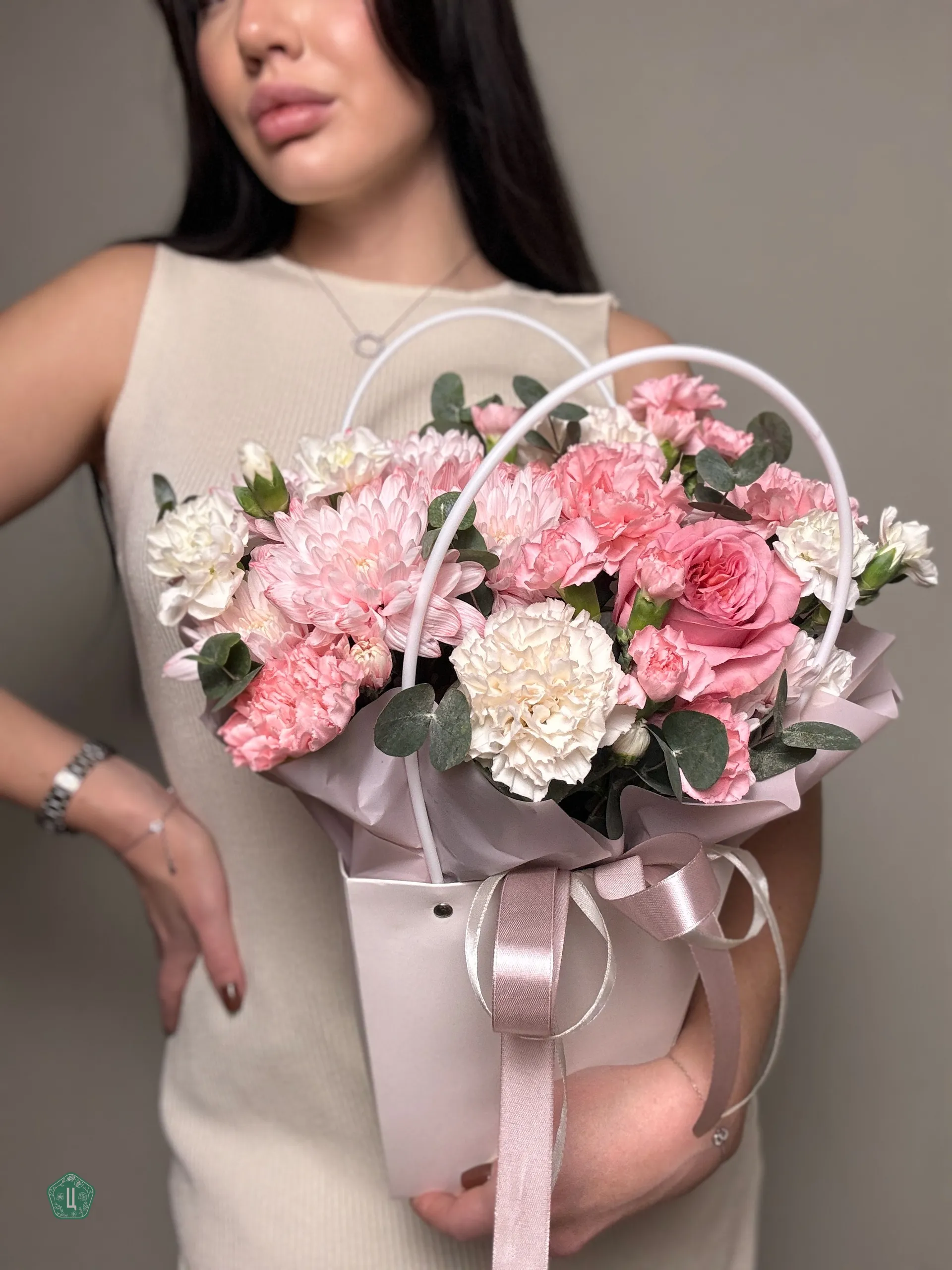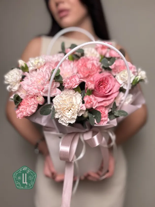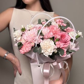 Композиция с пионовидной розой в сумочке