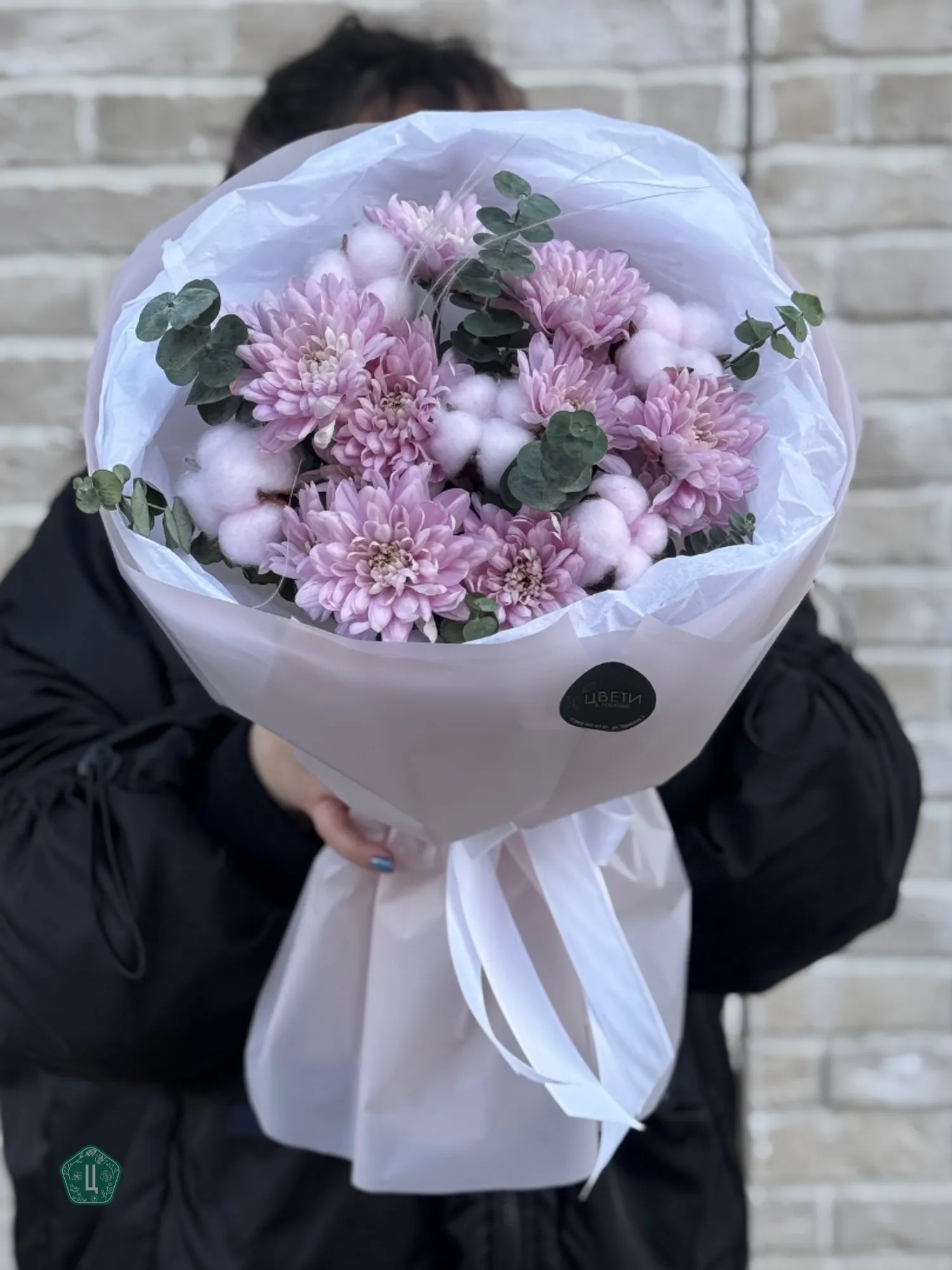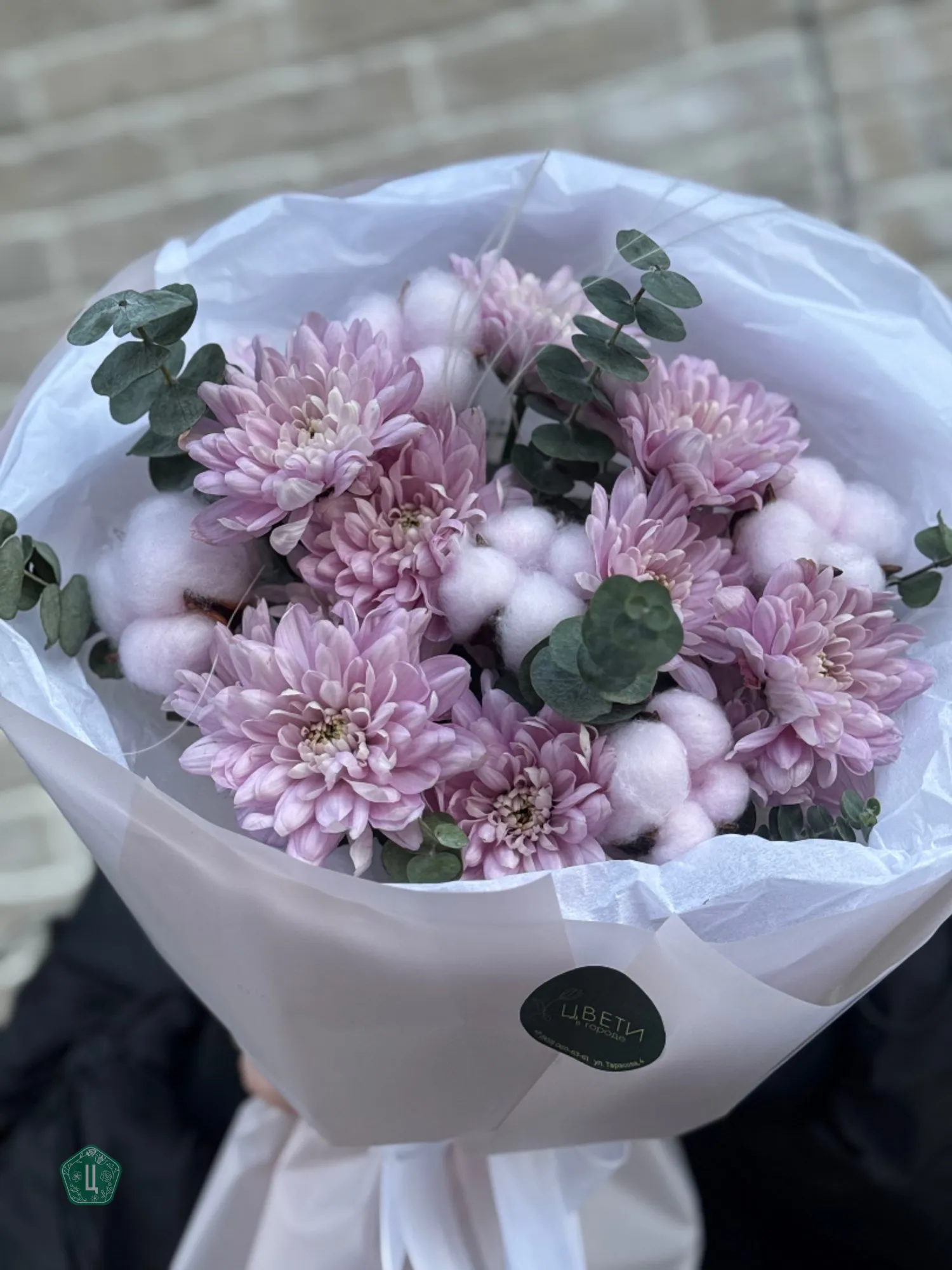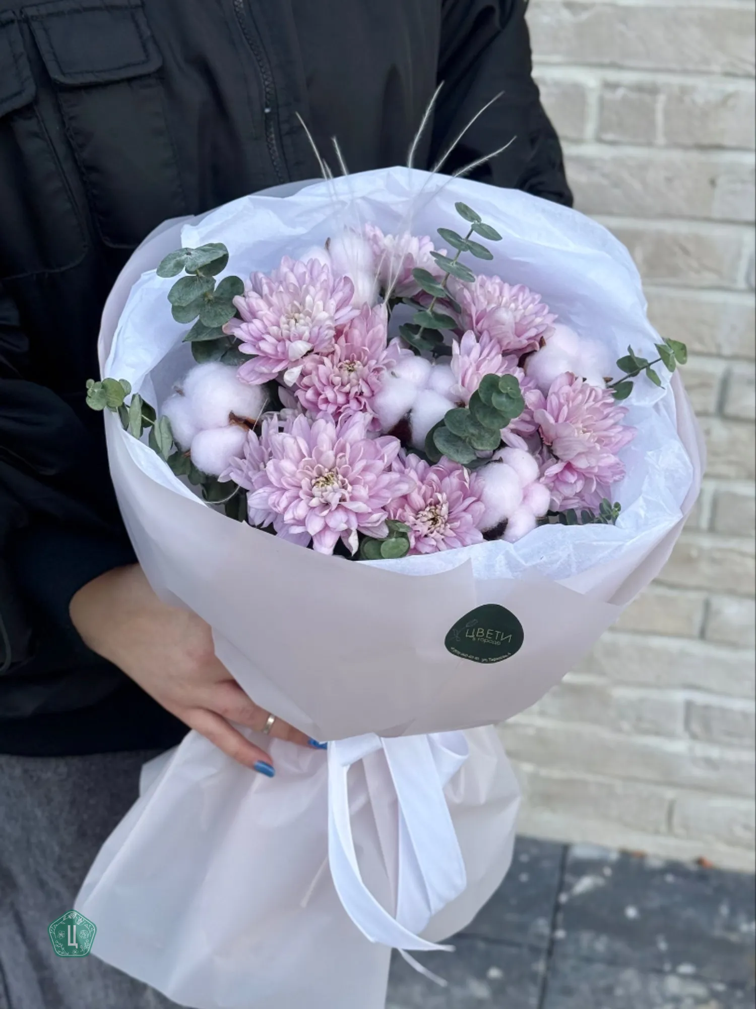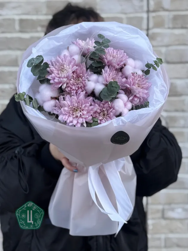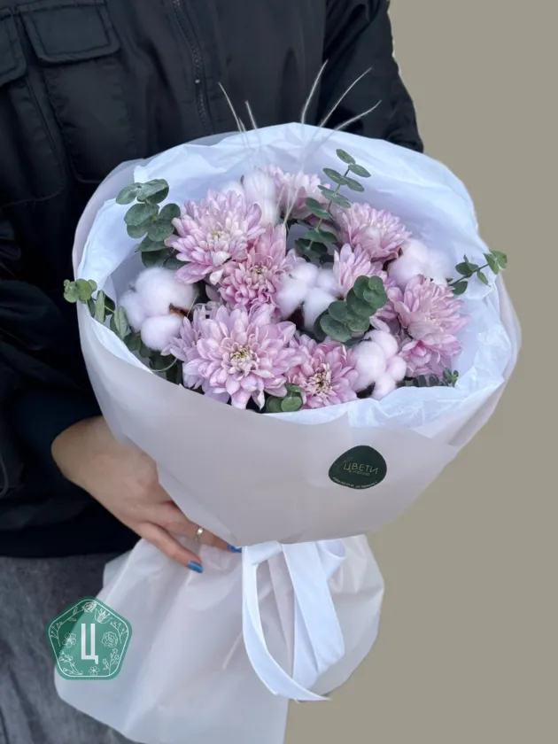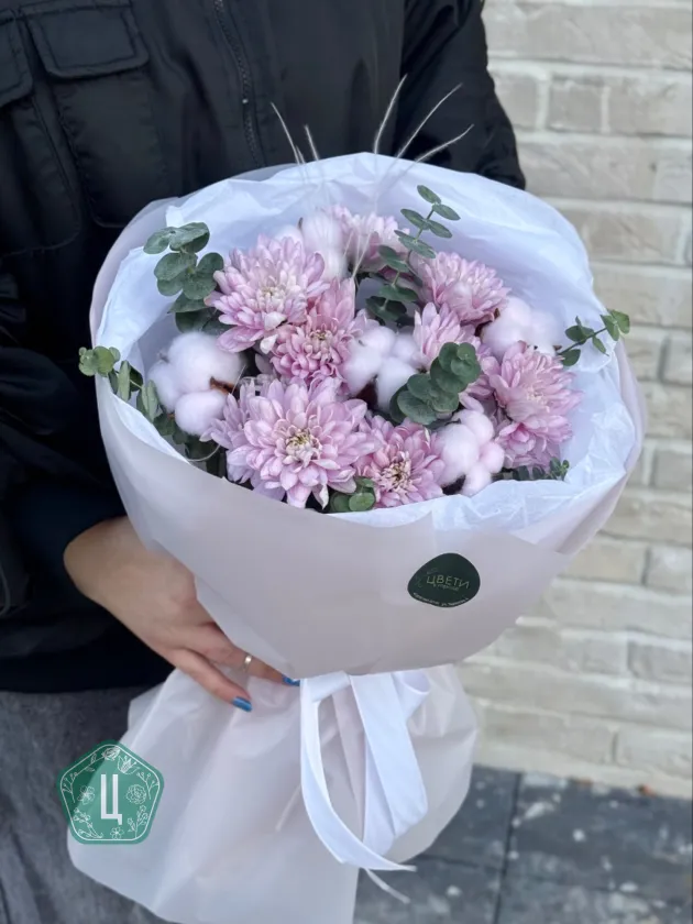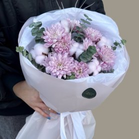Букет из нежных розовых хризантем, дополненный хлопком и эвкалиптом, создает атмосферу легкости и природной гармонии. Сдержанная элегантность и ненавязчивая красота делают его прекрасным выбором для любого повода. Хризантемы в оттенках бледно-розового цвета окружены воздушными белыми хлопковыми пухнастиками и свежими веточками эвкалипта, что придает композиции дополнительный объем и изящество.