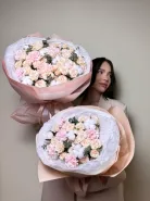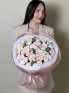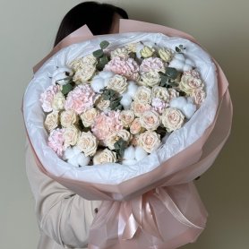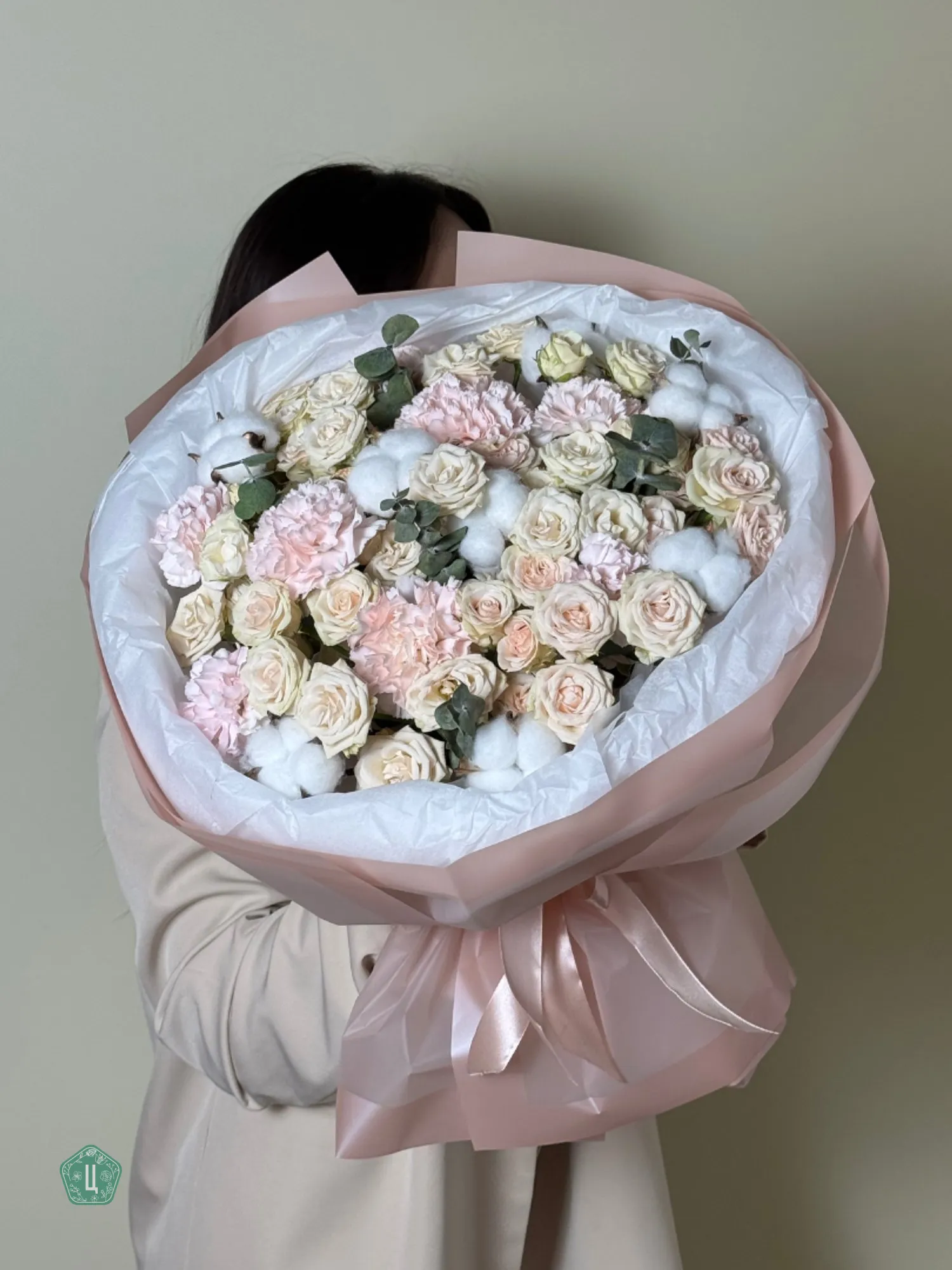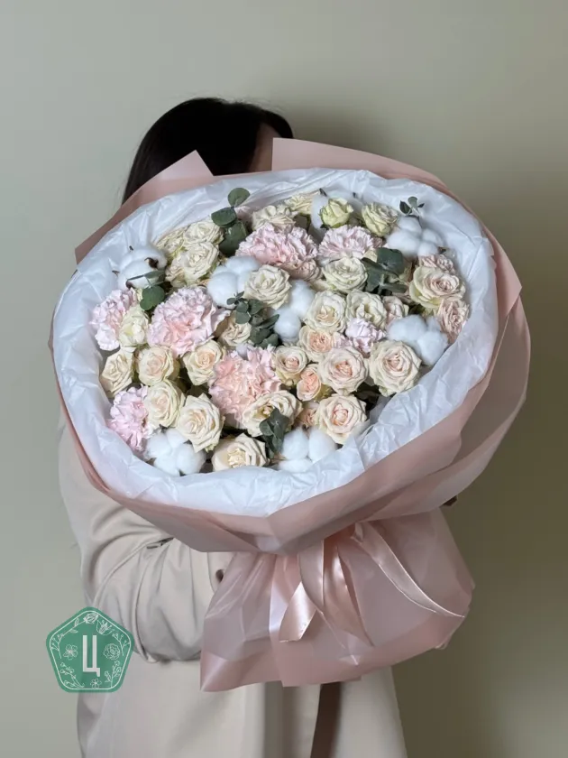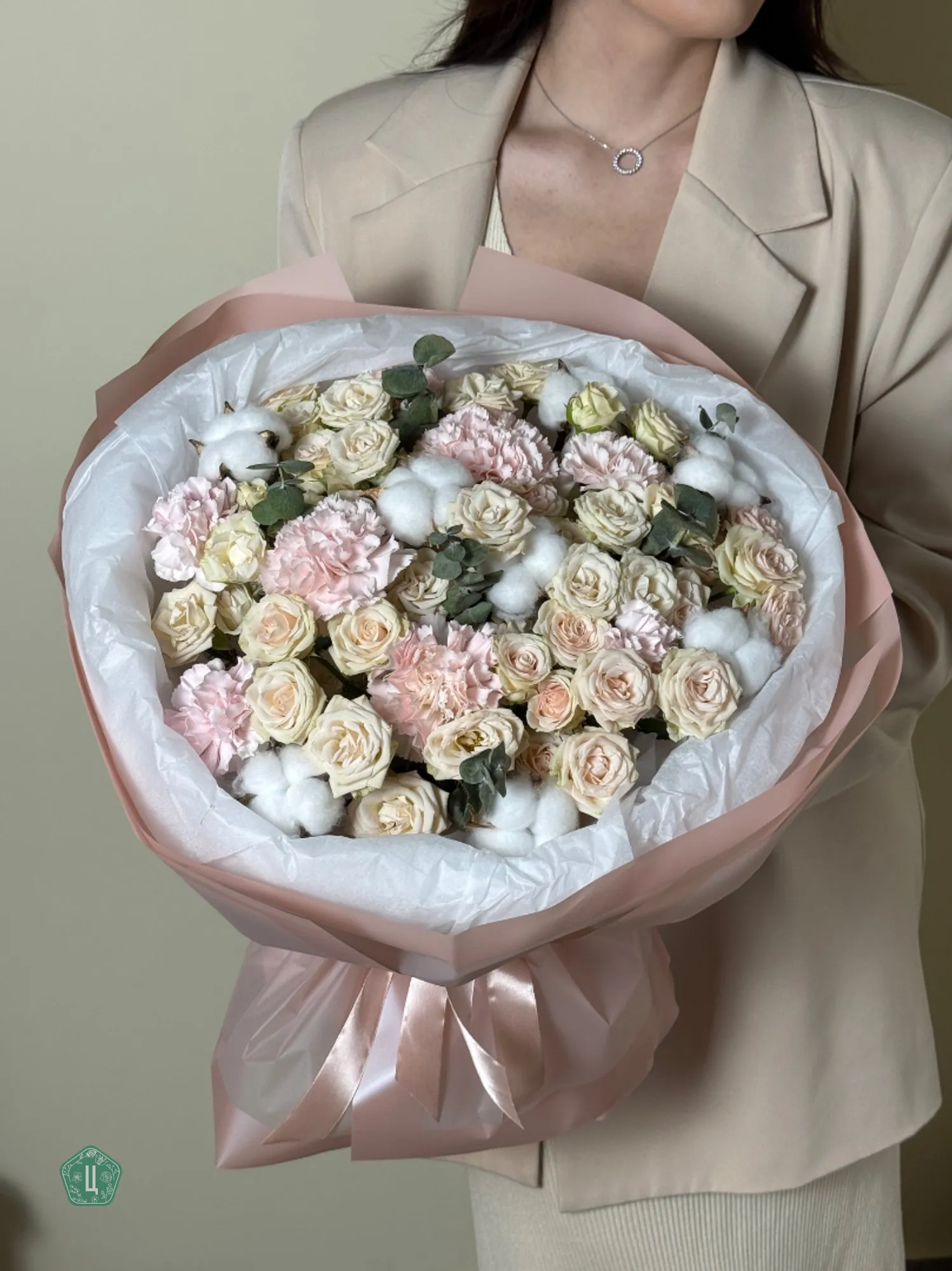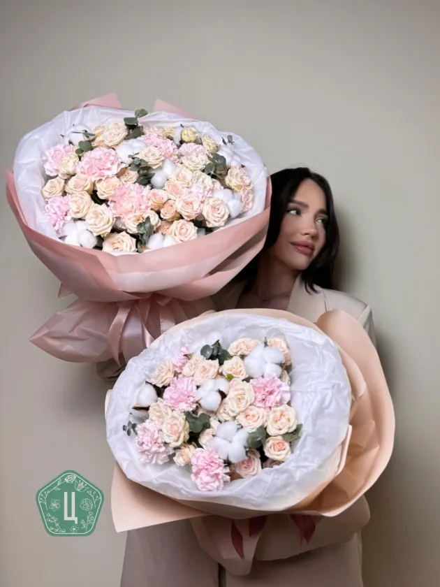 Нежный букет с диантусами, хлопком, кустовыми розами и эвкалиптом — это гармония воздушности, уюта и утончённой эстетики. Мягкие оттенки диантусов сочетаются с пушистыми облачками хлопка, а изящные кустовые розы придают композиции романтичность. Свежий эвкалипт добавляет букеты лёгкость, природный аромат и стильный современный акцент.Композиция выглядит тёплой, нежной и очень деликатной — идеальный выбор для подарка девушке, подруге, маме или просто дорогому человеку. Такой букет создаёт ощущение заботы и нежности с первого взгляда и дарит мягкое, светлое настроение.Букет, который говорит о самых искренних чувствах без лишних слов.