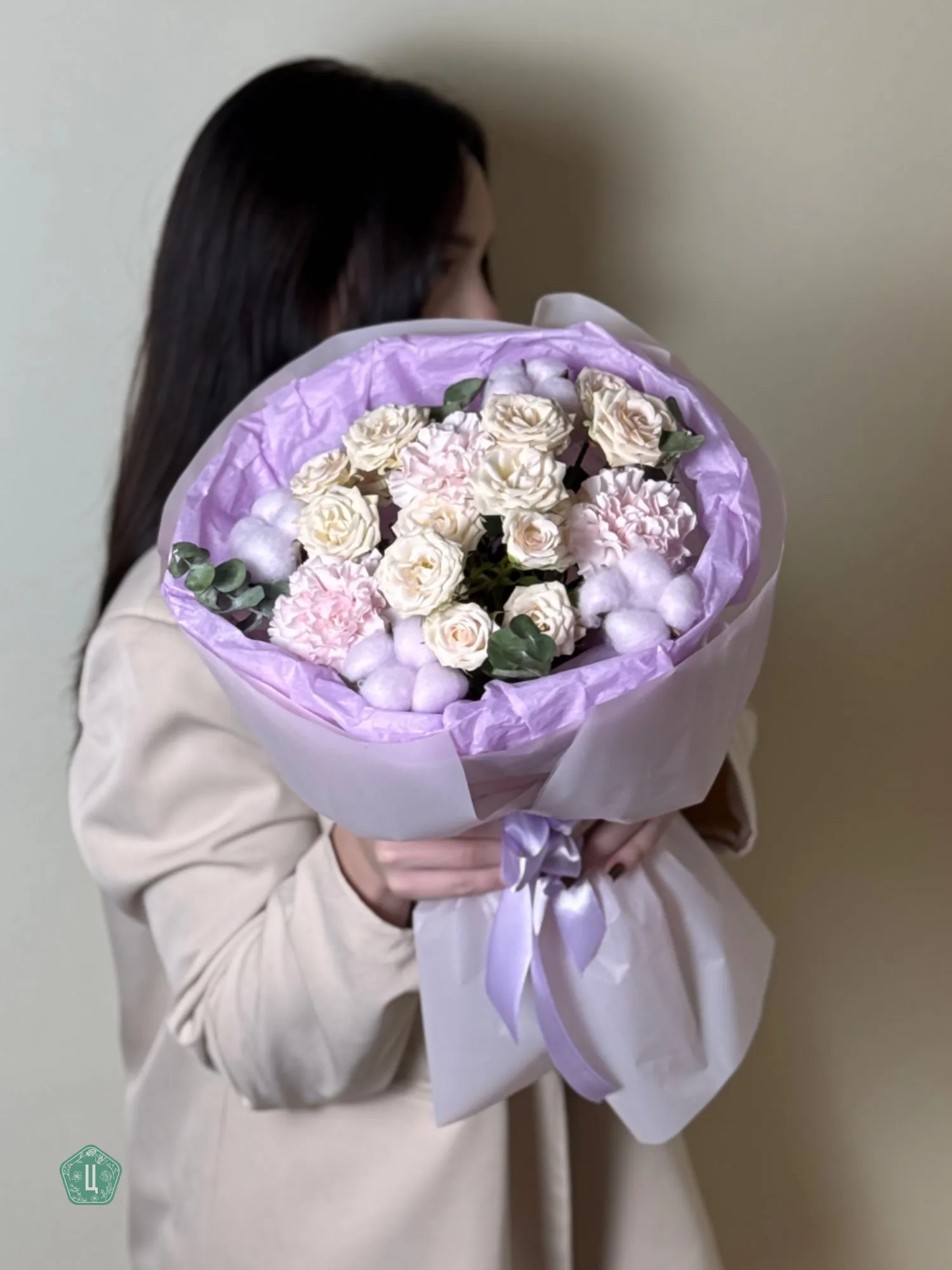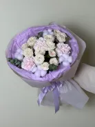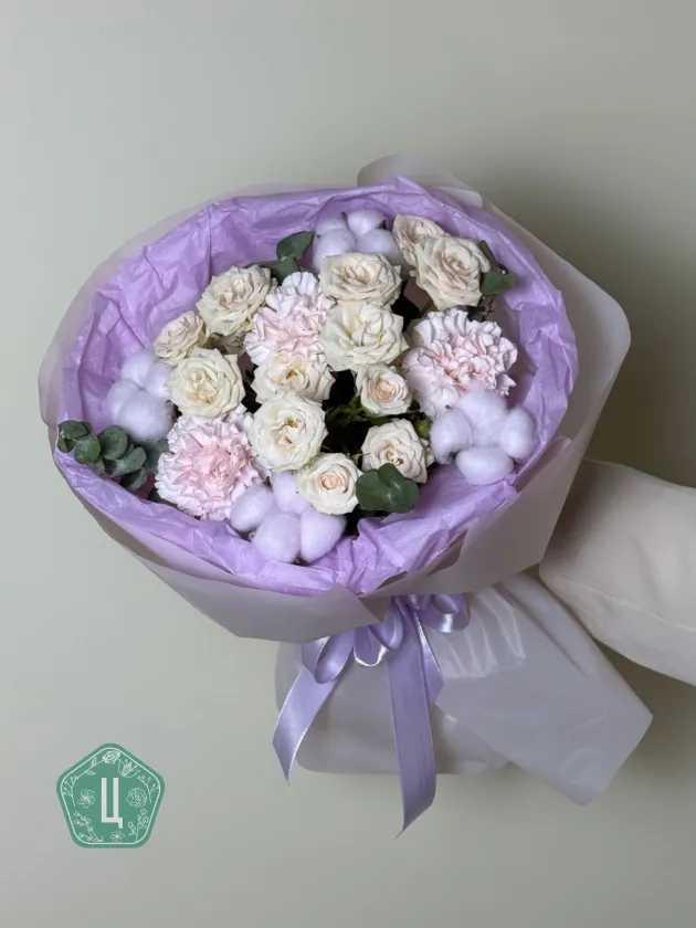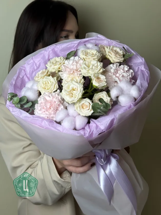 Нежный букет с диантусами, хлопком, кустовыми розами и эвкалиптом — это гармония воздушности, уюта и утончённой эстетики. Мягкие оттенки диантусов сочетаются с пушистыми облачками хлопка, а изящные кустовые розы придают композиции романтичность. Свежий эвкалипт добавляет букеты лёгкость, природный аромат и стильный современный акцент.Композиция выглядит тёплой, нежной и очень деликатной — идеальный выбор для подарка девушке, подруге, маме или просто дорогому человеку. Такой букет создаёт ощущение заботы и нежности с первого взгляда и дарит мягкое, светлое настроение.Букет, который говорит о самых искренних чувствах без лишних слов.